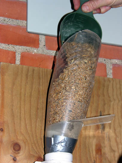 Frøene fyldes på i tragten, hvorfra de kan lukkes ind i maskinen lidt efter lidt.