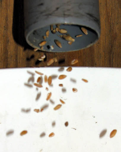 De (næsten) rene frø kommer ud forneden. Det er samme sted, luften slippes ind i systemet.