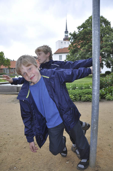 Vi fandt en hyggelig park i Itzehoe. Her snurrer Toke og Aske rundt om en stolpe.