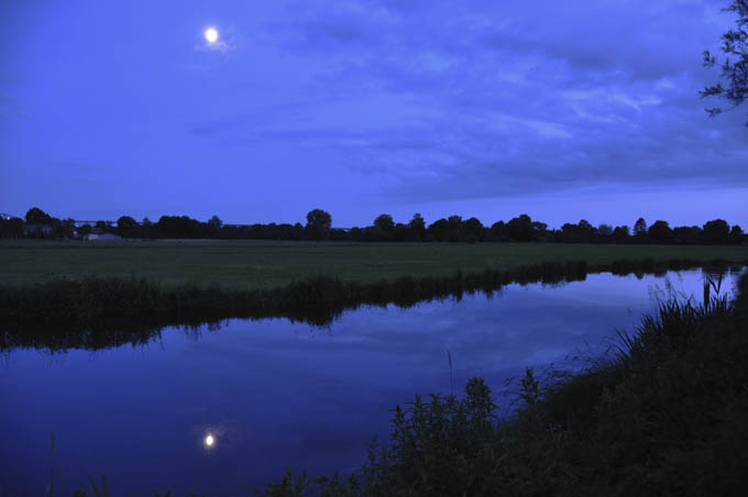 Månen spejler sig iu den lille sidekanal ved campingpladsen.
