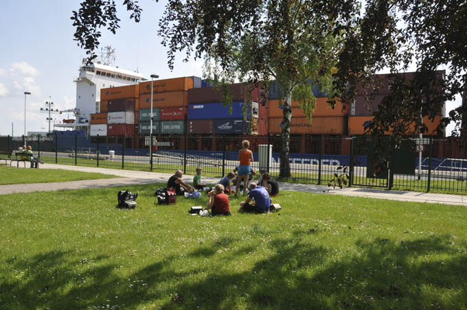 I Brunsbüttel mødte vi de cyklende cyklister, som her er stået af, ved sluserne til fælles frokost.