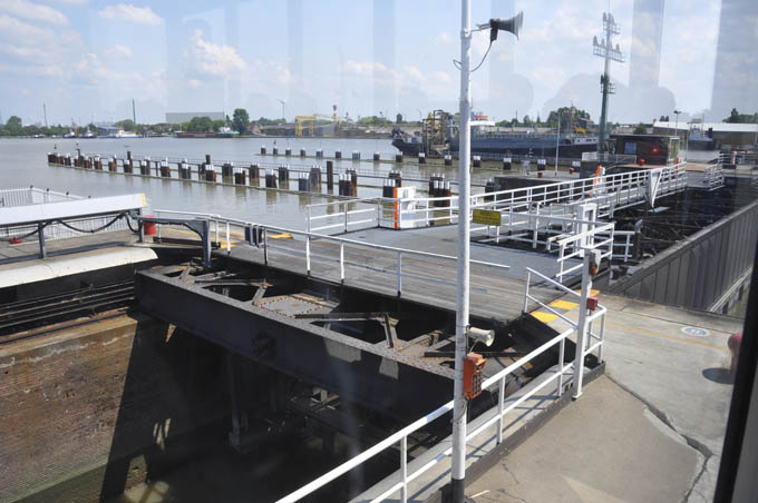 Efter at vandstanden i slusen er sænket, åbnes slusen i den anden ende.