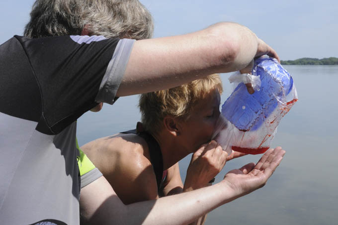 Karsten hjalp Sabine med at indtage jordbærsaft (efter at jordbærmosen var spist).