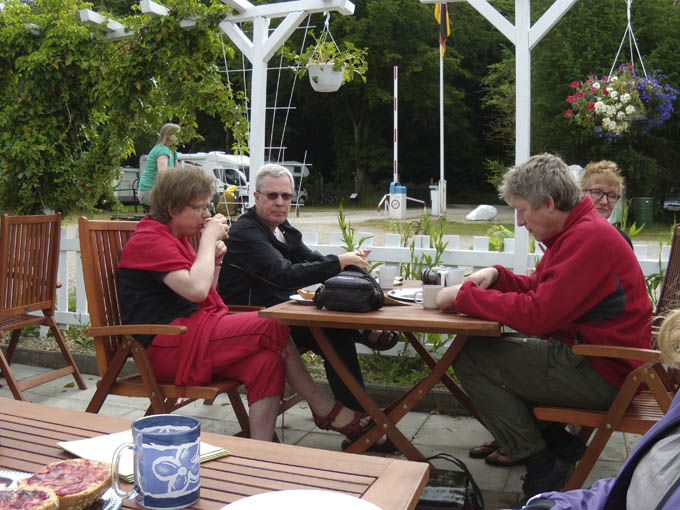 Søndag morgen: morgenmad på terrassen. Ea, Vagn, Carsten og Sabine.